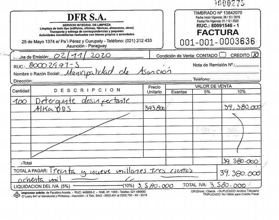 Por otra parte, ayer Wilfrido Cáceres, jefe de Gabinete de la Municipalidad de Asunción, intentó justificar el precio del detergente, señalando que es un producto de uso profesional de máxima desinfección y no precisamente para lavar cubiertos, sin embargo, Gómez de la Fuente manifestó que cualquier comercio puede utilizar el producto con todas las medidas de precaución, porque el producto concentrado puede ser nocivo para la salud.
