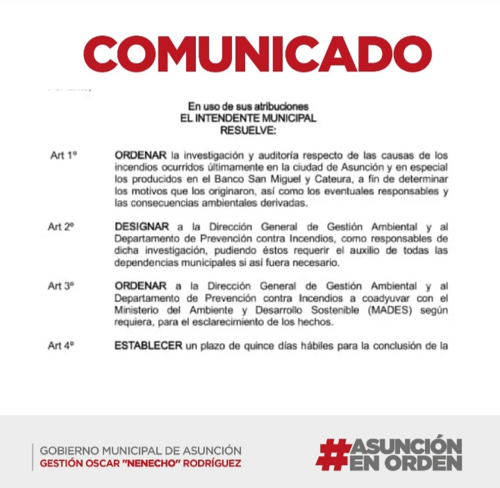 El intendente de Asunción, Óscar Rodríguez, ordenó a través de un comunicado se establezca una investigación para llegar a los responsables de los incendios producidos en Banco San Miguel y el vertedero de Cateura. "En mi administración ningún hecho punible quedará impune", aseguró.